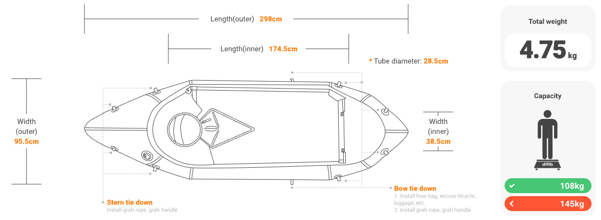 Powiększona przestrzeń pozwala na przechowywanie dużej ilości bagażu. Można na niej swobodnie przywiązać rower. Po zdemontowaniu pokładu można załadować psa. Można również rozbudować ten packraft do wersji 1.5, dodając przednią poduszkę dla dziecka.