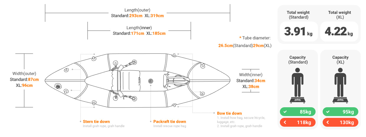 Uwaga! Dla lepszych właściwości nautycznych i bezpieczeństwa w tym modelu zaleca się stosowanie nieco wyższego ciśnienia (zwłaszcza w zimnych wodach). Ze względu na umiejscowienie wiosłującego na środku długich burt, zbyt niskie ciśnienie może prowadzić do zginania się kadłuba. Jeśli nie można osiągnąć pełnego ciśnienia siłami własnych płuc, zalecamy małą pompkę.